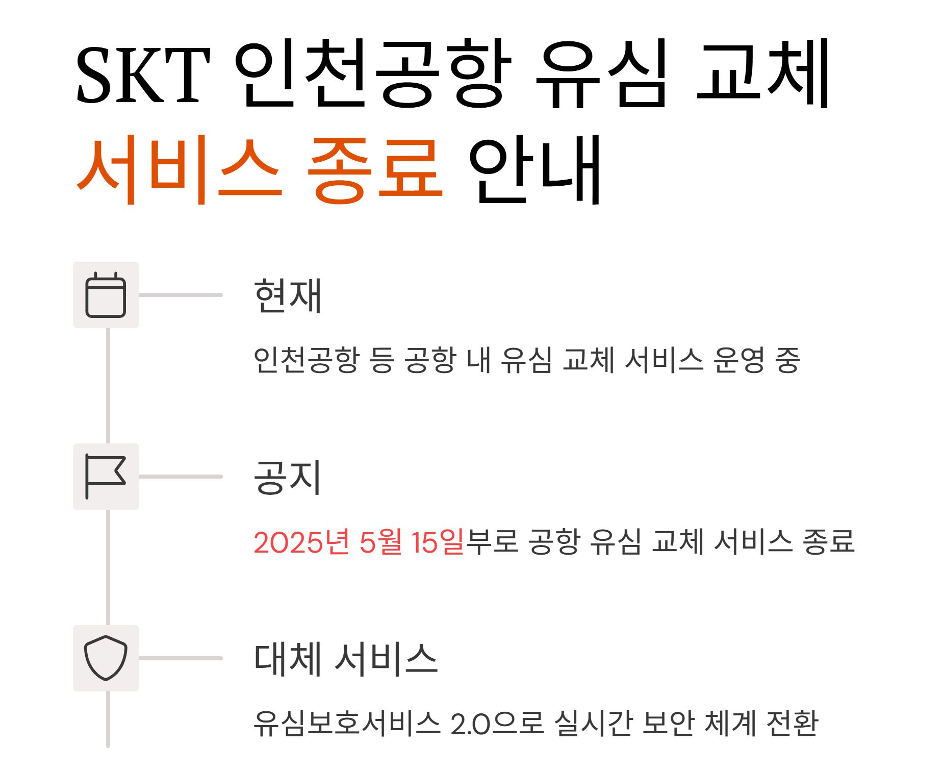 해외 출국 전 유심을 바꿔야 할지 고민이신가요? 이 글은 5월 14일 이전 ‘인천공항 유심 교체’ 정보를 찾는 SKT 고객을 위한 정확한 최신 안내입니다. 공항 유심 교체 운영 종료일, 이후 대안, 그리고 유심보호서비스 2.0의 모든 내용을 정리했습니다.