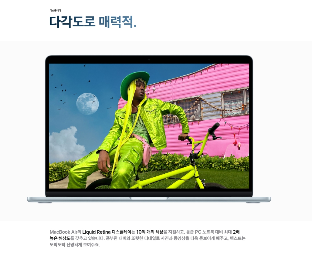 디스플레이에서도 " MacBook Air의 Liquid Retina 디스플레이는 10억 개의 색상을 지원하고, 동급 PC 노트북 대비 최대 2배 높은 해상도를 갖추고 있습니다. 풍부한 대비와 또렷한 디테일로 사진과 동영상을 더욱 돋보이게 해 주고, 텍스트는 또박또박 선명하게 보여주죠."라고 공식홈페이지에 자신 있게 이야기하고 있다. 이것이 정말로 대단한 것은 Liquid Retina 디스플레이가 2022.07.15에 출시된 MacBook Air M2에서부터 탑재되었다는 점이다. 3년이 지나가는 시점의 2세대 전의 모델이 2025년 현재 경쟁하고 있는 PC노트북의 디스플레이 사양보다도 더 우위를 점하고 있다는 점이다.